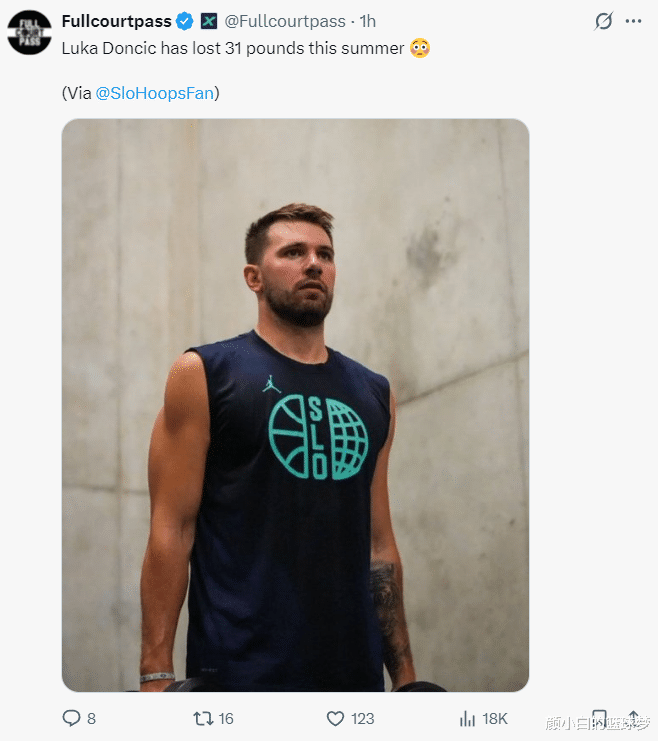 根据SlohoopsFan的报道,东契奇今夏已经成功减重31磅(约28.16斤),东契奇也从一个小胖墩瘦成一道闪电,此前东契奇在《男士健康》杂志专访中说过今夏为了减脂增肌他一个月没有摸过球全都在健身房里苦练。