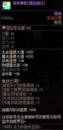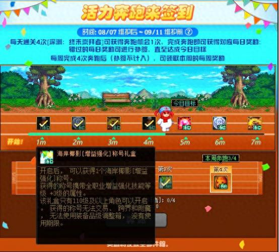本次的活力奔跑签到活动送了一个全职业通用的3级称号海岸椰影,这个称号之前送过比较多了,不过作为五一称号的下位替代品,强度相当不错。