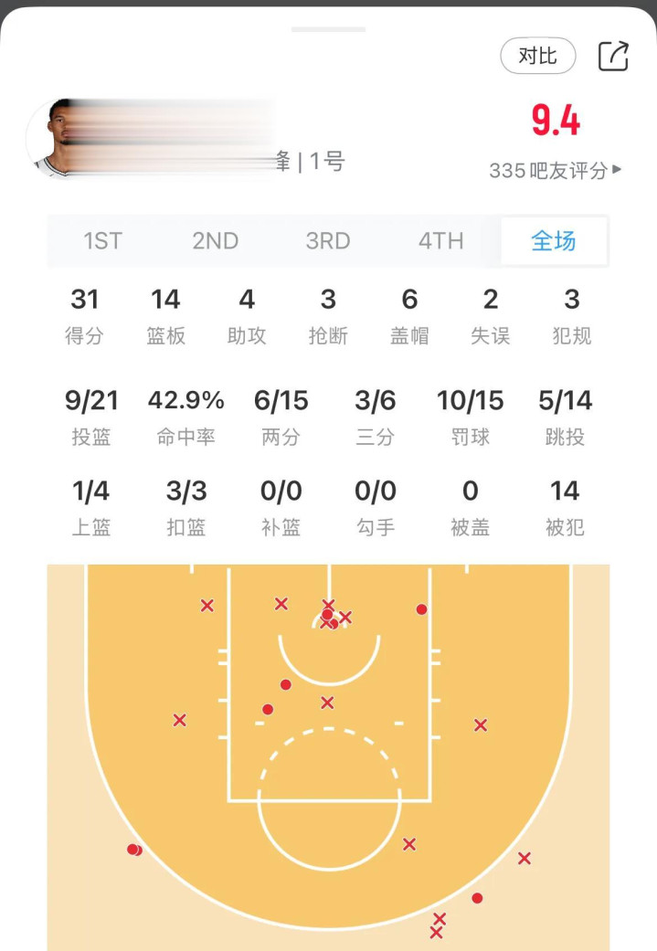 本场比赛文班亚马拿下31分14篮板4助攻3抢断6盖帽的超级全面数据,可以说再次统治了攻防两端,打的对手篮网队毫无脾气。