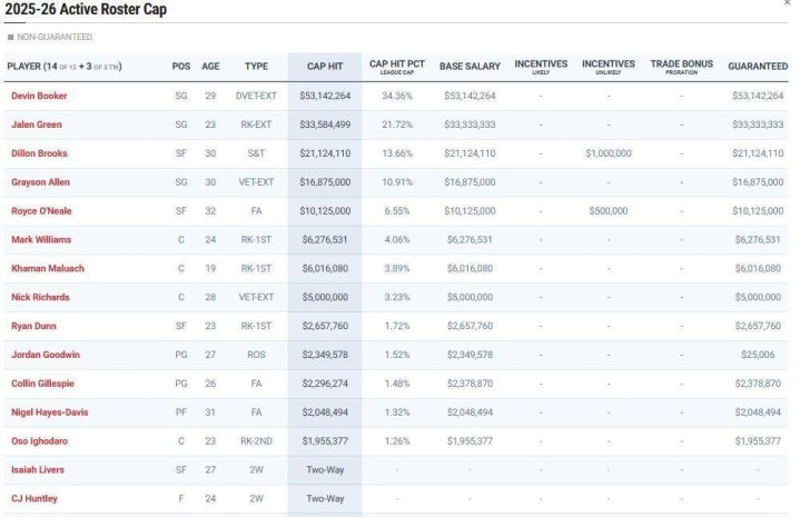 - 潜在首发: 德文·布克、杰伦·格林、狄龙·布鲁克斯、罗伊斯·奥尼尔、马基夫·莫里斯