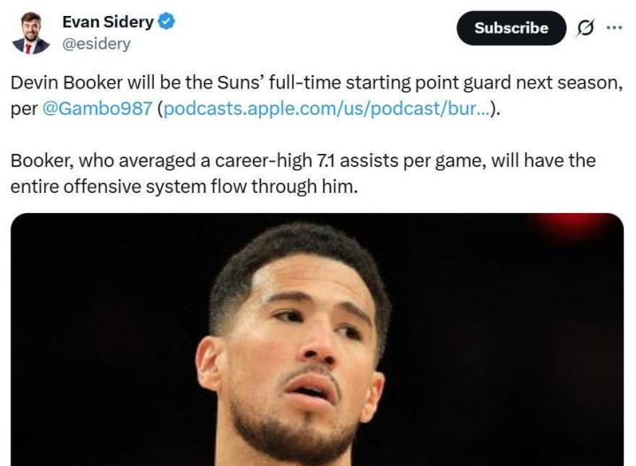 此外,太阳队的布克也准备好了全力支持这对新双核的搭档。根据太阳队记者John Gambadoro的报道,布克将主动放弃得分后卫的位置,转为担任全职控卫,这将为杰伦·格林提供更多空间。布克在2024-25赛季就曾客串过控卫,虽然场均助攻创下了个人新高(7.1次),但他也坦言,控卫位置的挑战仍然不小。然而,他愿意为球队做出牺牲,为了能够最大化球队的整体效能。