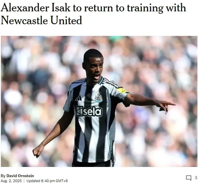 TA记者DO消息,伊萨克已返回英国,并且将恢复在纽卡斯尔的训练。