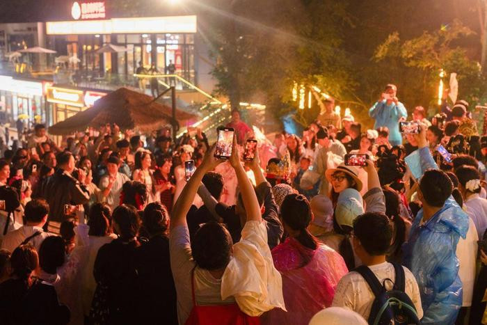 灯火次第点亮,奏响浪漫狂想曲。入夜,柿岩古村同步跌入璀璨星河,成为名副其实的“夜游天堂”。非遗游鱼灯拉满多民族文化氛围,少数民族NPC快闪互动妙趣横生,民族摇滚乐队、异域风情舞蹈、篝火联欢晚会轮番点燃夜晚,全域视听盛宴全面开启烟火时代。