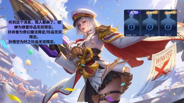 由于珍品无双的价格相比较常规无双是翻倍的,所以玩家每年能看到的珍品无双其实是并不会很多的,最多会跟典藏皮肤上新的数量持平,相当于今年玩家保不齐是还会看到新的珍品无双进行上线的,这款皮肤要么给到孙悟空,要么就是孙尚香的。