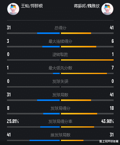 本场比赛蒋振邦和魏雅欣都不在最佳的状态中,二人失误都比较多,但还是凭借更强的实力,以2-0横扫韩国组合王灿/郑娜银,晋级混双四强,距离世界大赛两连冠还差2场胜利!