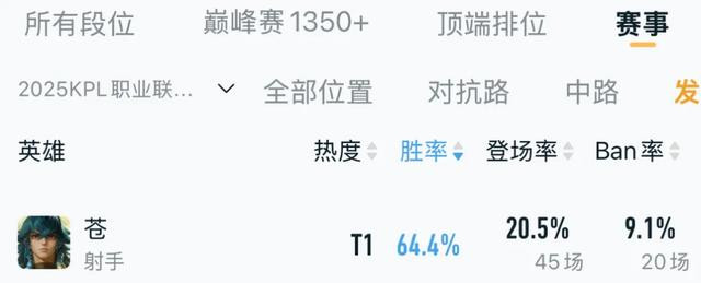 苍在2025KPL职业联赛里面登场率有20.5%,胜率居然高达64.4%,胜率高的恐怖