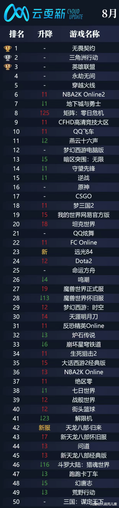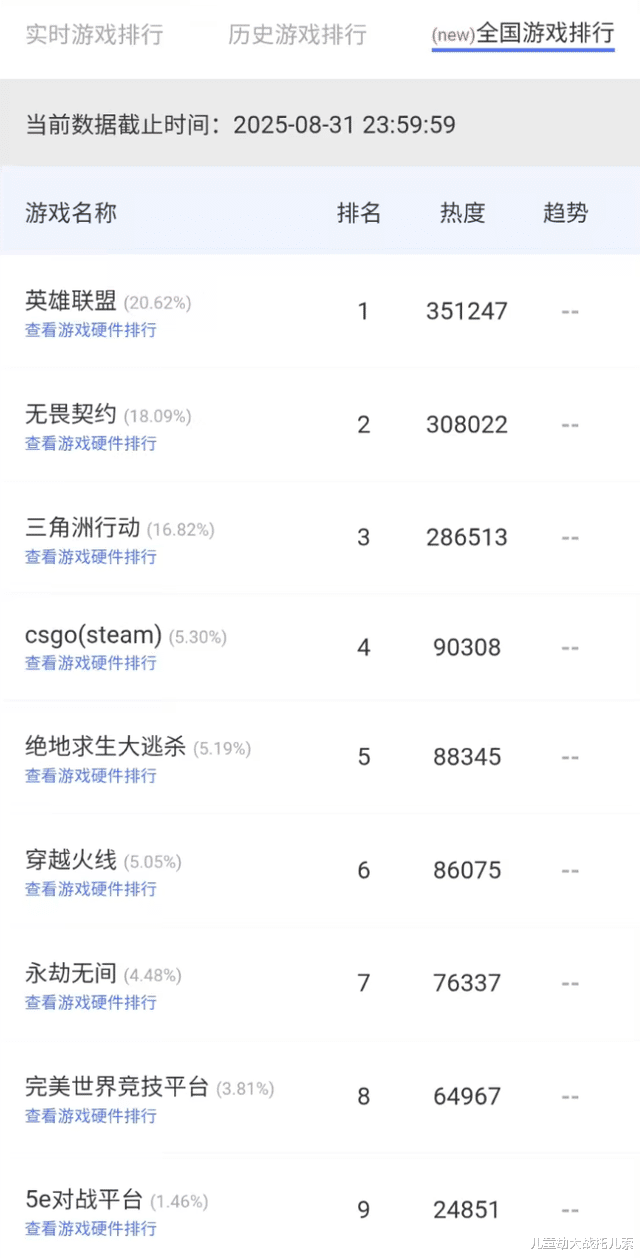 据“精灵AI”统计的全国网吧游戏实时数据,截至2025年8月31日,《无畏契约》以18.09%的热度占比、超30万的热度值位列第二,展现出在FPS赛道的强劲实力。而从“云更新”平台基于游戏启动次数生成的热度榜单来看,《无畏契约》更是独占鳌头,充分彰显了其在网吧领域的高人气。