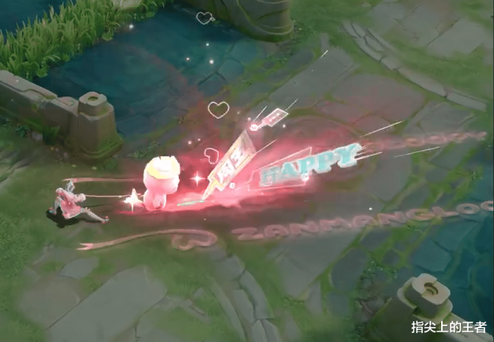 二技能蓄力身后出现粉色拖尾,自拍杆在地面拖拽出轨迹,向前横扫,并划出一道弧光,赞萌露比贴纸跃出。
