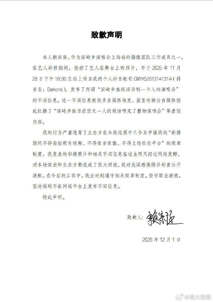 12月1日,据澎湃新闻消息,所谓滨崎步“一个人的演唱会”信息不实,系彩排期间被偷拍,摄像团队人员公开致歉。