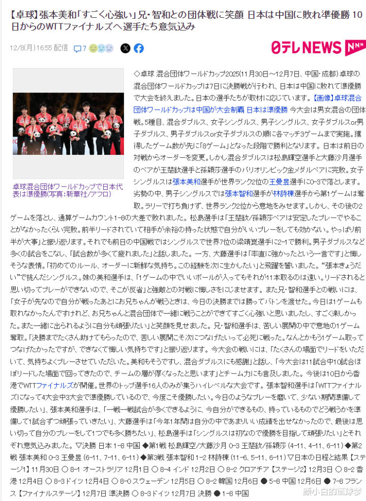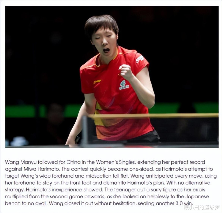 ITTF在官网的文章中就扎心了张本美和:王曼昱在混团世界杯决赛的第二盘中出战,并延续了她对阵张本美和的完美战绩。王曼昱毫不犹豫地锁定胜局,再次以3-0的比分获胜。