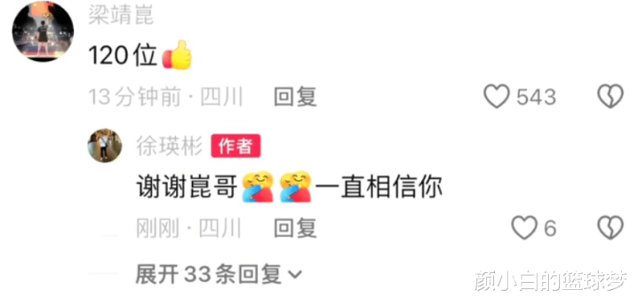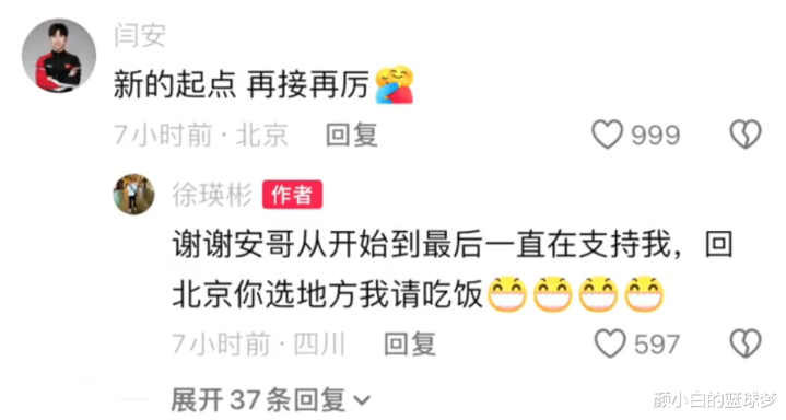 徐瑛彬发布自己的社媒后,闫安:新的起点,再接再厉。